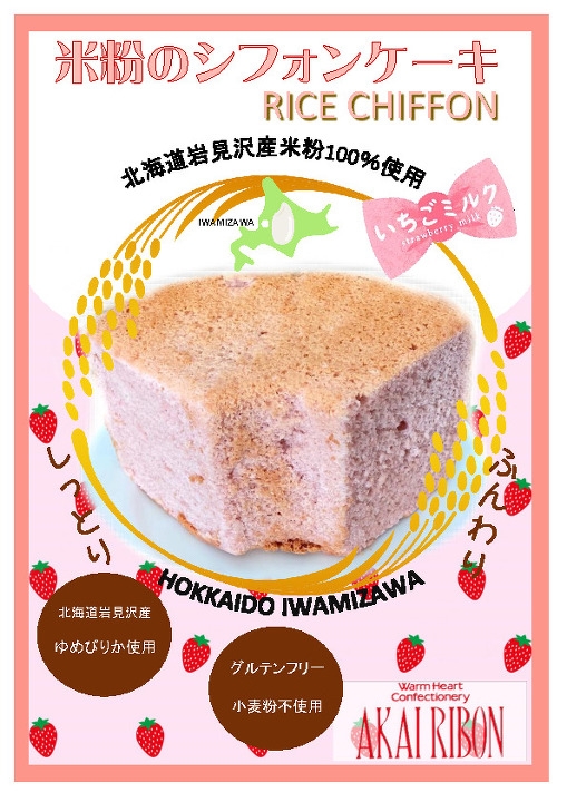 岩見沢産の米粉を100%使用し、ふんわり・しっとり仕上げることにこだわったシフォンケーキです。